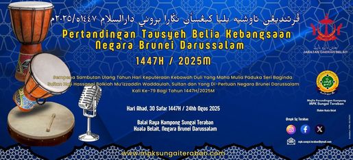 Majlis Perundingan Kampung - MPK Sungai Teraban, Mukim Kuala Belait sekali lagi akan menganjurkan Pertandingan Tausyeh Belia Kebangsaan 1447H/2025 sempena Sambutan Hari Keputeraan Kebawah Duli Yang Maha Mulia Paduka Seri Baginda Sultan dan Yang Di-Pertuan Negara Brunei Darussalam Ke-79