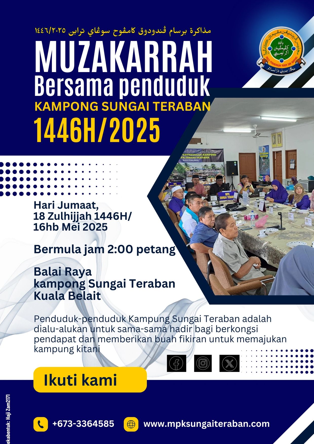 Penduduk Kampong Sungai Teraban dan sekitarnya adalah dialu-alukan untuk sama-sama-sama hadir di Baiali Raya Kampong Sungai Teraban, Kuala Belait. Sisi Muzakarah akan dirmulakan pada jam 2:00 petang